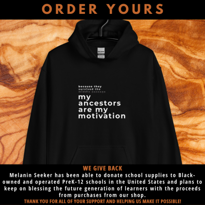 "My Ancestors Are My Motivation" Clothing Our shop is a supplement to our online platforms that provide daily FREE trivia questions about everything and anything Black Facts, Black History, Black People from around the African Diaspora. Make sure to visit us and we hope to inspire you to learn a new nugget of Black History! WHEN YOU SHOP WITH US WE GIVE BACK Melanin Seeker has been able to donate school supplies to Black-owned and operated PreK-12 schools in the United States and plans to keep on blessing the future generation of learners with the proceeds from purchases from our shop.