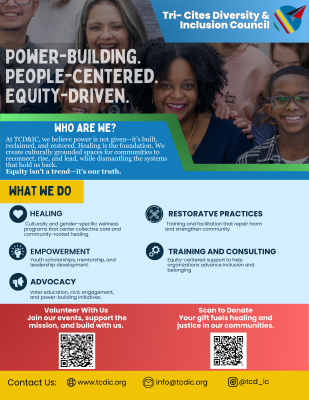 The Tri-Cities Diversity & Inclusion Council (TCD&IC) is a nonprofit organization committed to building equitable, healing-centered communities. We serve as an anchor for culturally specific wellness, restorative justice, empowerment, and advocacy for people of color. Our services include trauma-informed sisterhood healing programs, youth scholarship and leadership development, DEI training and consulting, and restorative practices workshops. We also lead civic engagement efforts, cultural events, and community forums. Through community-rooted initiatives, we address generational trauma, uplift youth and families, and create space for shared power and community voice. We partner with organizations to embed equity and belonging into their practices. At TCD&IC, equity isn’t a trend—it’s our truth. We believe in power-building, people-centered change that restores dignity and reimagines justice.
